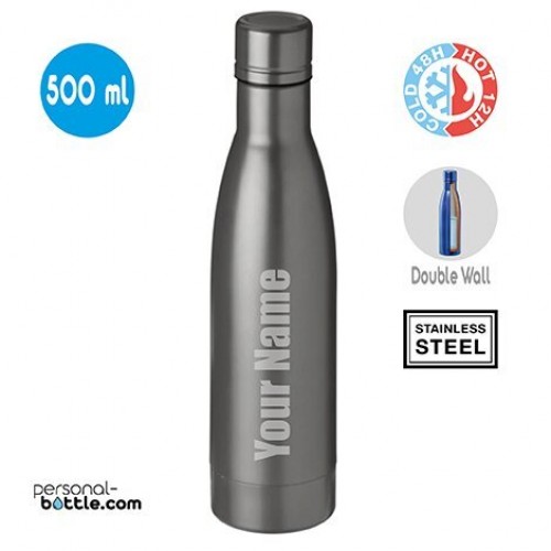 We laser graveren onze producten - dit verwijdert een laag van de gekleurde coating waardoor het roestvrij staal eronder zichtbaar wordt. Dit betekent dat uw naam een metallic/zilveren uitstraling heeft. De flessen worden GRATIS op maximaal formaat van 30 x 30 mm gegraveerd. Voor een andere maat betaalt u een kleine toeslag.